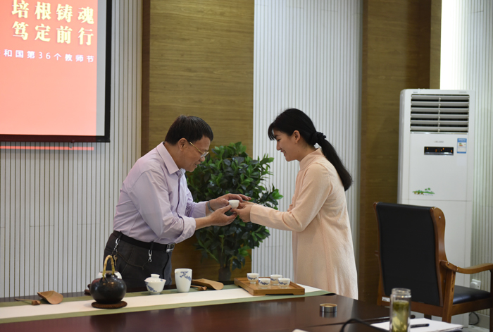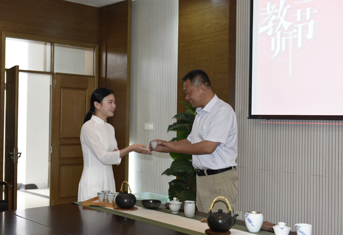 9月10日上午,校区开展“悠悠茶香、师恩难忘”主题教师节活动。来自19、20级茶艺与茶叶营销专业毕业生在第36个教师节来临之际,返回母校,演绎《师恩难忘》主题茶艺表演,以一杯香茗,敬一生师恩。来自19级毕业生豆文静说到,茶蕴平淡,色泽醇和,馨香内敛,恰如为师之路,平淡而又平凡,其味悠远。表演过程中,她们解说到,“用爱泡茶,将真诚与感激灌注茶与水的交融,激荡出甘润香甜的茶汤。一杯好茶敬师恩,感谢母校三年来对她们的栽培。”