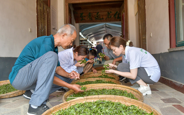 实践团队来到64岁的老党员韦君余的徐福茶厂。只见韦君余头发灰白、十分瘦削,你无法想象这样一个老汉是这片茶园的主人,更无法想象他与这片茶园共风雨已四十余载了。在韦厂长的带领下,团队党员教师、学生一起参观了徐福茶厂的发展史,聆听了一位老党员讲述他的老茶人梦。他讲述到,1983年春天的某一天,经过与家人的商量,他正式承包茶厂。十年间,从刚开始的没能够交齐承包费,到后来成立了茶业合作社,吸收了上千社员发展茶叶,走“产、加、销、培”一体化的发展之路。就是这样一份坚守,让他带动当地绿茶发展达2600余亩,让3000余户农民脱贫致富。