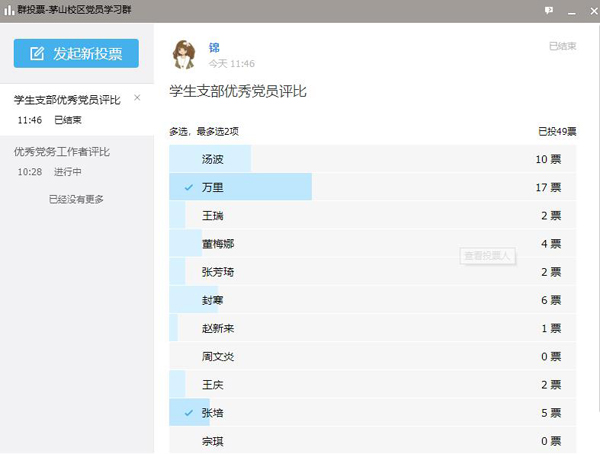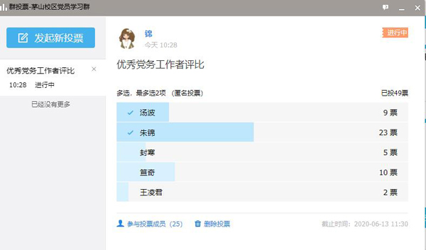 6月12日,校区党总支开展优秀党员、优秀党务工作者民主评议活动。按照之前动员会上要求,本次评选采用线上匿名投票的形式。投票之前严格检查各党员同志的学习强国积分排名,按照上一年度学习积分排名在学校党员人数后50%的党员不得推荐上报为优秀党员和优秀党务工作者的原则确认参评党员名单,目前校区共有教职工党员29名,优秀党务工作者投票26人,超过党员总人数三分之二,投票有效,最终朱锦同志得票最高,推荐为优秀党务工作者。优秀党员投票25人,超过党员总人数三分之二,投票有效,最终徐超同志和万里同志推荐为优秀共产党员。