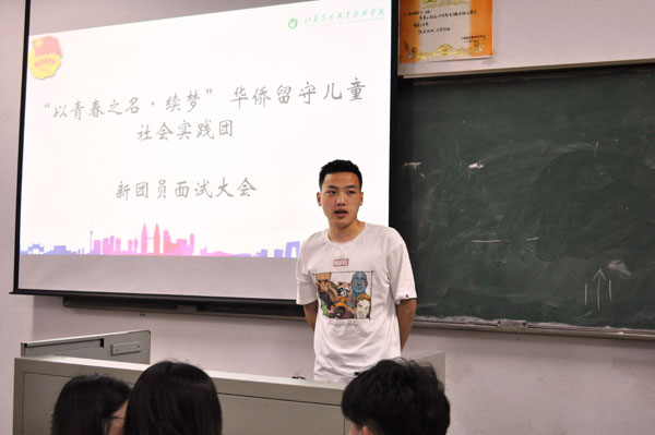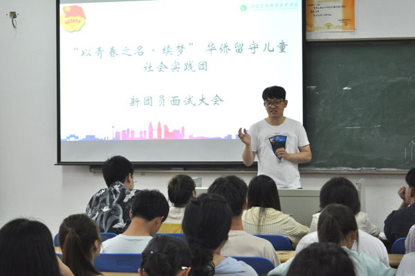 5月13日,2018年“续梦·关爱华侨留守儿童”暑期社会实践汇报会和新团员面试工作在校区举行。 汇报开始,首先由指导老师周文炎带领团员代表回顾了前三年暑期社会实践团赴浙江省文成县开展实践活动的点滴。随后,2018年、2019年实践团团长分别做了实践汇报和表态发言。汇报会结束后,开展了2019年新团员招募仪式,本次活动共有200余人报名,最终,束方会、丁楚婷等10名同学通过面试,成功入选为2019级团队成员。 2019年新的征程即将开始,志愿者们将会带着志愿初心扬帆起航。