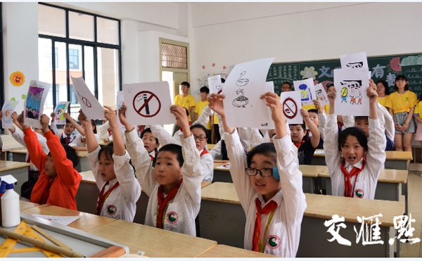 活动中,学生志愿者用图文并茂的PPT、简单精彩的“禁烟手指舞”等通俗易懂的形式为小学生们介绍吸烟对人体的害处,通过几个禁烟示范性动作,让小学生了解如何拒绝吸二手烟或如何劝阻他人吸烟。志愿者们还利用废弃矿泉水瓶、香烟、吸水纸等材料做香烟燃烧实验,实验结果显示水变浑浊,吸水纸变黄,更加直观地展示了吸烟对人健康的危害。最后,大小学生携手共绘禁烟标识,主题画形式多样,构思巧妙,颜色多彩,教育意义鲜明。