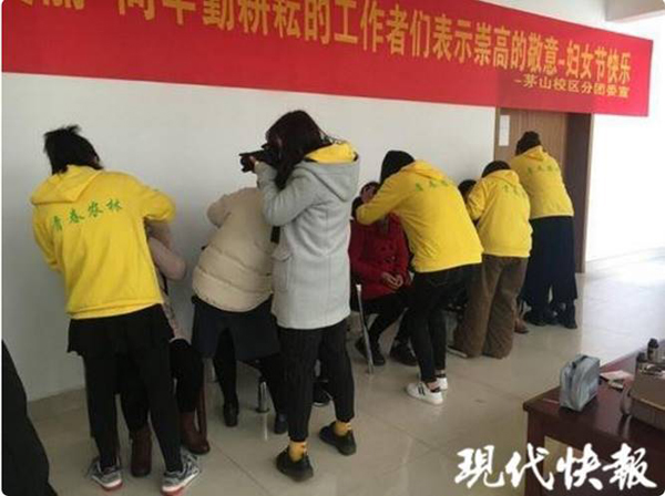 在“三八”妇女节来临之际,校区团委组织30多名志愿者,化身“美妆师”和“摄影师”,来到句容市环卫处,给10位环卫阿姨化上妆,拍上美照,让她们美美地过一个特别的节日。