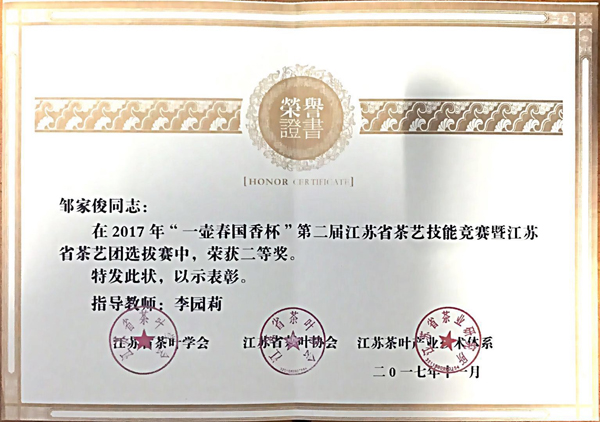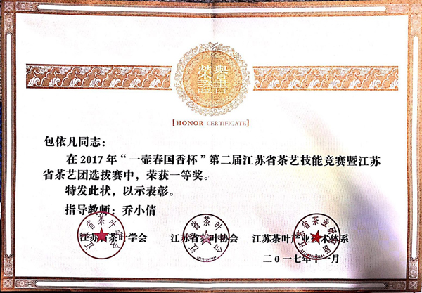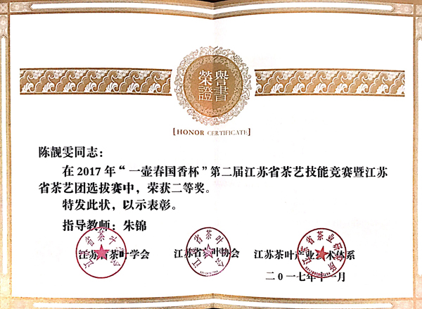 11月28日至29日,“一壶春国香杯”第二届江苏省茶艺技能竞赛暨江苏省茶艺团选拔赛在溧阳市圆满落幕。大赛以延续优良传统、弘扬传统文化、选拔优秀茶艺人为目标,引导江苏茶艺向科学、健康的方向发展,为江苏茶行业从业者及茶文化爱好者提供了展示与交流的平台。 本次大赛包括理论考试、规定茶艺、自创茶艺三个环节,15茶艺专业包依凡同学演绎的作品《茶续》荣获一等奖,邹家俊同学以《守护》为主题的表演获得二等奖,代表茗苑茶叶公司参赛的陈靓雯同学以《融•和》为题的表演获得二等奖。三位同学同时入选江苏省茶艺团。