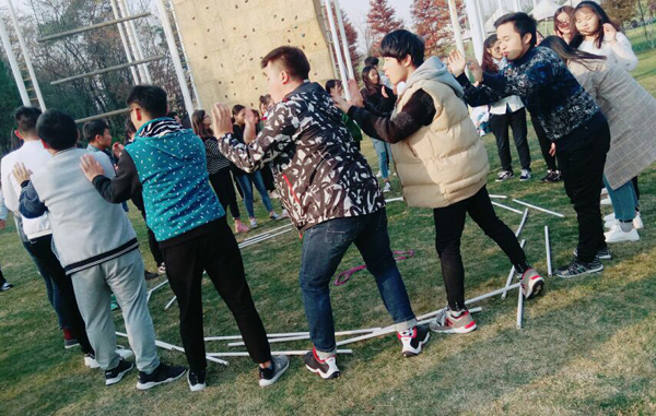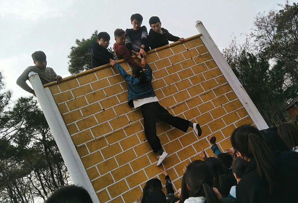 本次素质拓展以小组为单位进行,在热身游戏“讨价还价”和“鸡蛋变人”的环节中,活动的气氛逐渐被带动起来,成员间建立起了相互的信任。在之后“穿越电网”、“不倒森林”、“翻越毕业墙”的环节中,同学们相互协调,配合默契,完成了一个又一个具有挑战性的任务。随着每一次任务的完成,成员们感受到的不仅仅是成功后的喜悦,还有团队成员相互支持的力量。