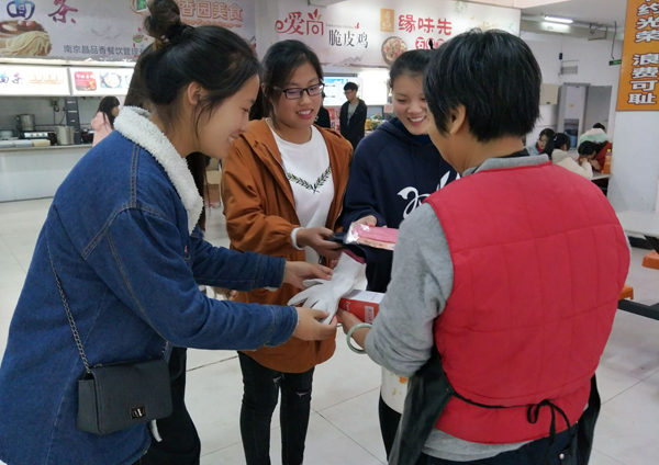 11月23日,“心馨园”心理协会的同学们,带着精心准备的小礼品,为校区的清洁工阿姨们送上了最衷心的感恩问候,同学们为清洁工阿姨们换上了崭新的护袖、口罩,随后也一起加入了清理校园杂物的行列中。