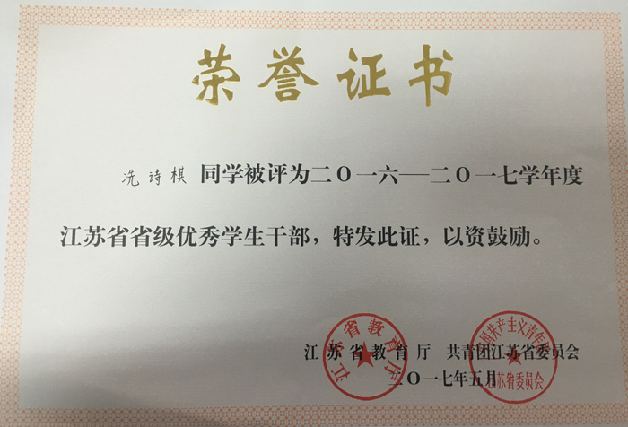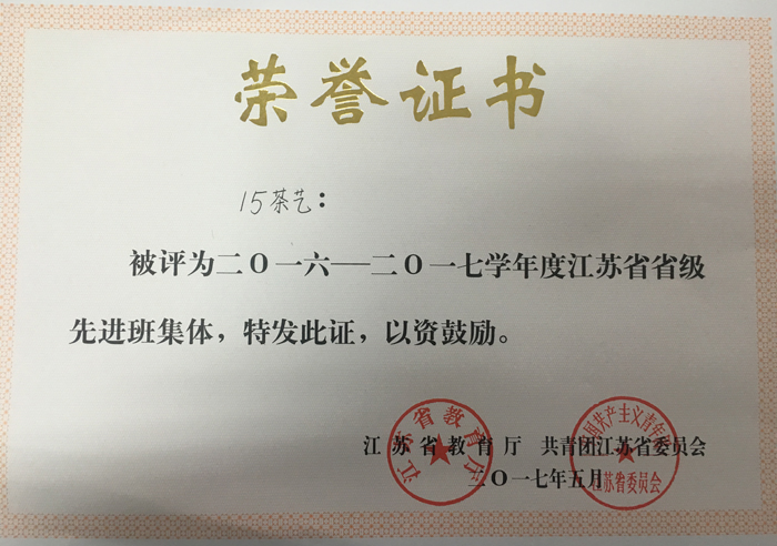 在我院省级三好学生、优秀学生干部和先进班集体评选工作中,校区15茶艺班被评为2016—2017学年度江苏省省级先进班集体,15茶艺班冼诗棋同学被评为江苏省省级优秀学生干部,特此向获得荣誉的班级和学生表示祝贺。