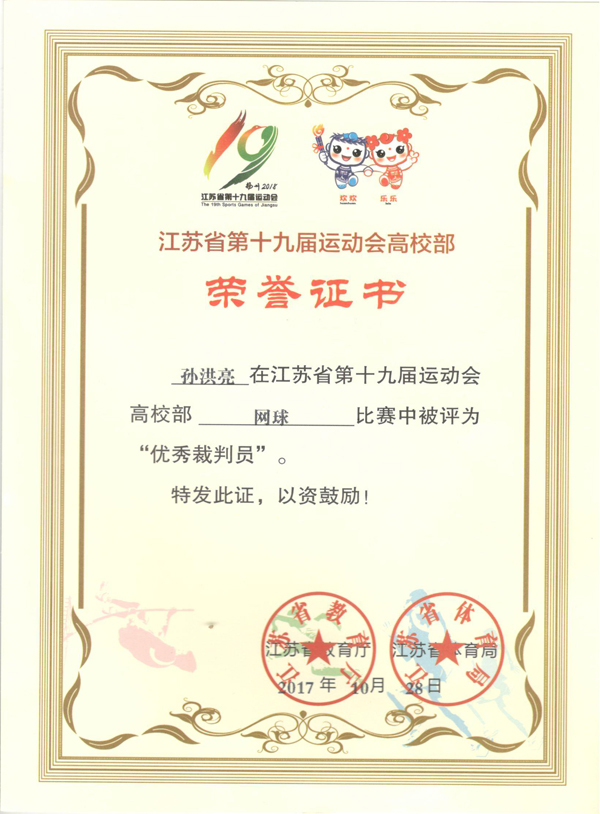 由省教育厅、省体育局主办的江苏省第十九届运动会高校部甲组网球比赛于2017年10月22日至26日在南京师范大学举行。组委会选调我校孙洪亮老师担任本次比赛的裁判工作。在比赛过程中,孙洪亮老师严肃认真,公正裁决,秉公执法,严格遵守比赛规程,被评为优秀裁判员。