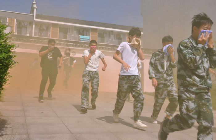 上午11时,演习正式开始。现场浓烟滚滚。随着急促的警报声响起,学生们也立即用毛巾捂住口鼻,在安保人员和老师的引导下,有序撤离到安全地带。