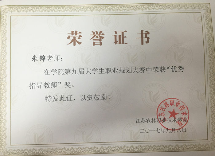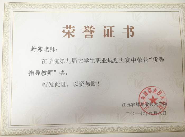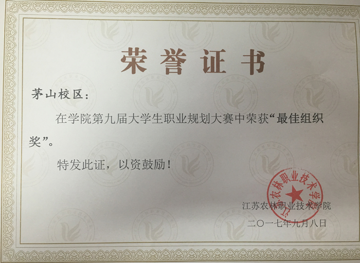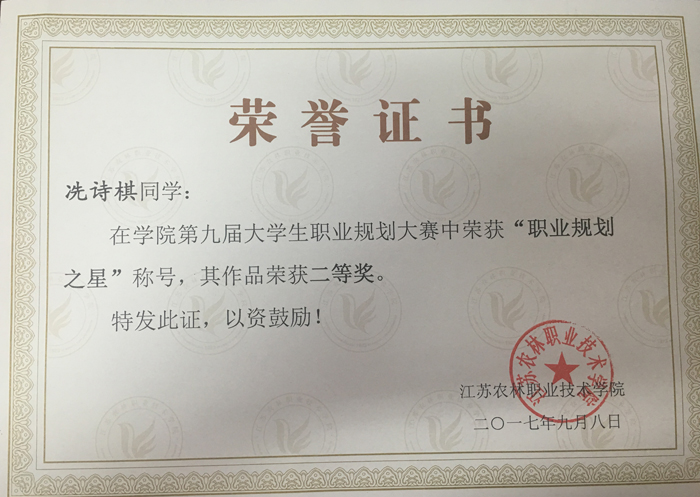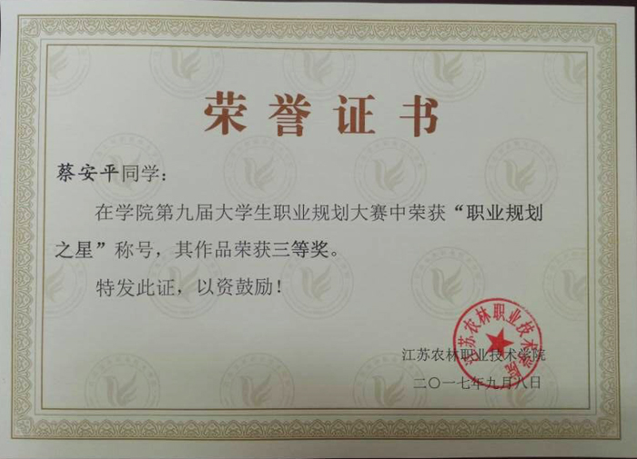 在2017年4月—9月举办的学校第九届大学生职业规划大赛中,校区荣获“最佳组织奖”,15茶艺班冼诗棋同学荣获“职业规划之星”称号,其作品荣获二等奖,16园艺技术1班蔡安平同学荣获“职业规划之星”称号,其作品荣获三等奖,朱锦老师、封寒老师荣获“优秀指导教师”称号。其中,冼诗棋同学的作品已报送至省里参评,代表学校参加省职业规划大赛,在此祝愿她能在接下来的比赛中一切顺利,取得优异的成绩。
