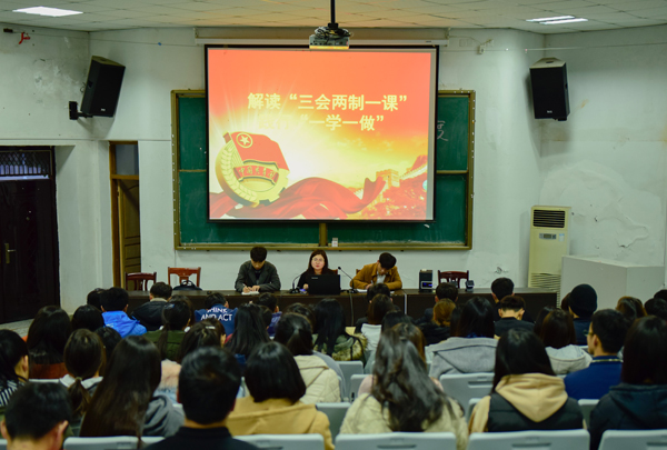 为了更好地学习贯彻共青团中央在全体共青团员中开展“学习总书记讲话 做合格共青团员”即“一学一做”教育实践的精神,充分发挥共青团作用,校区分团委于3月20日晚6点在报告厅组织召开了共青团专题会议,由学生会主席冼诗棋为大家做“三会两制一课”,践行“一学一做”的“团课”,校区各班级团支书、全体学生会成员参加会议。