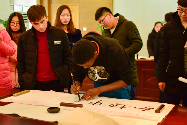 汉字作为中华文化传承的载体,包含了一代代先人们的智慧结晶。为亲近母语,传承经典,积极响应中央“增强文化自信”的号召,2月22日下午,由校区分团委主办的“亲近母语,爱我母语”主题宣传活动在图书馆会议室展开。参加本次活动的有校区分团委书记朱锦老师、书法社指导老师赵新来老师、信息工程系学生会同学、外国留学生、维吾尔族学生代表和书法社团的同学。