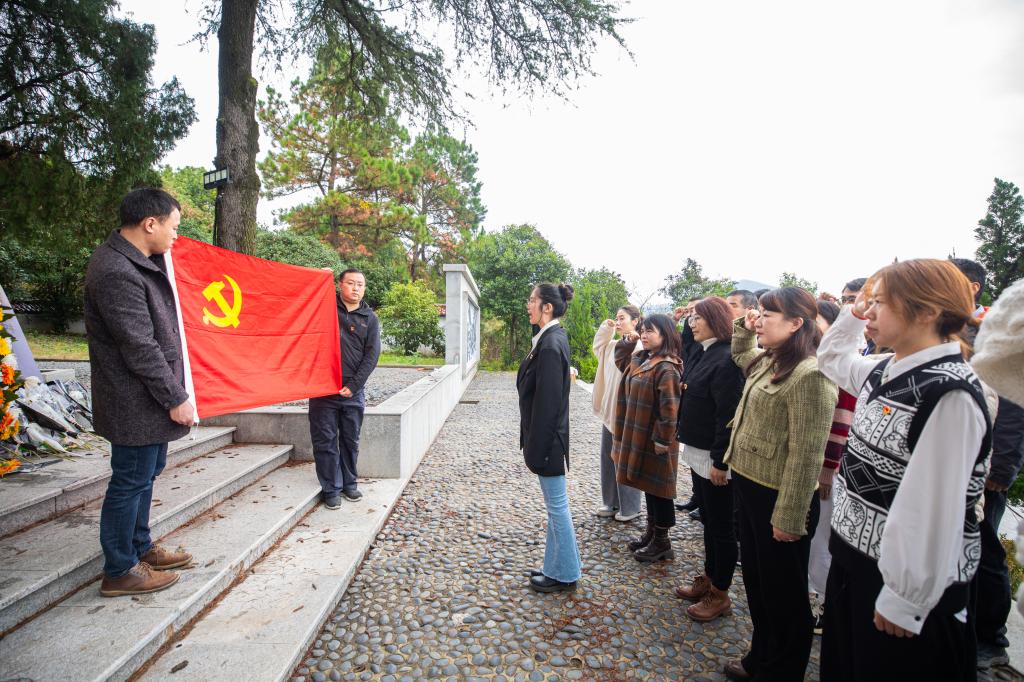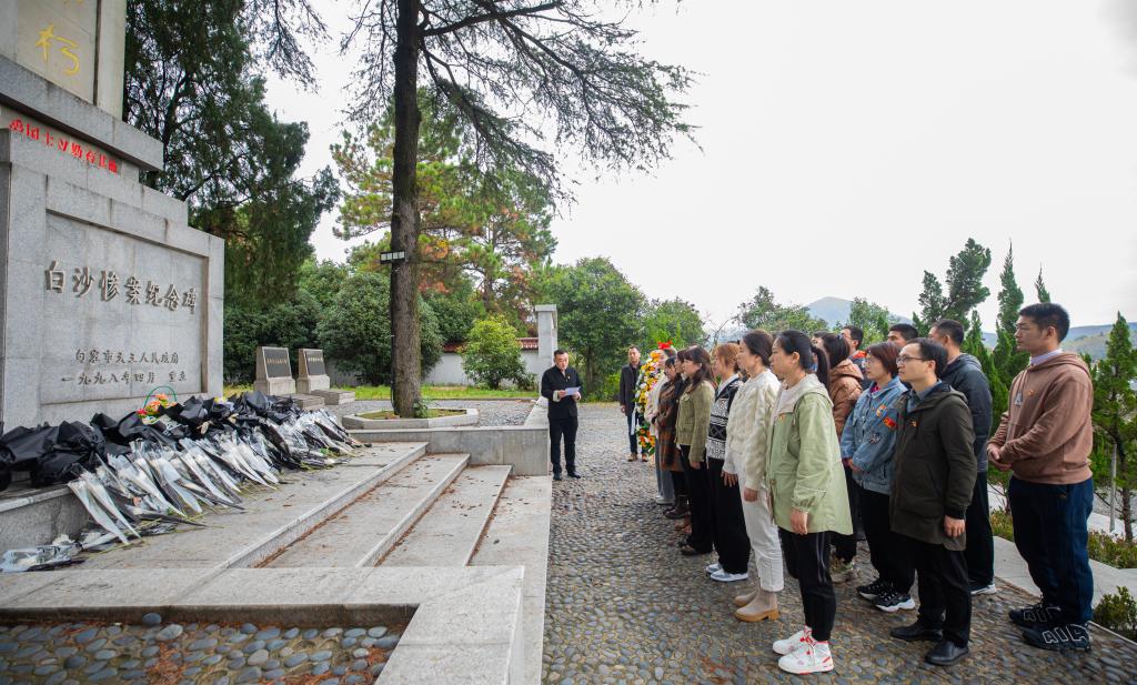 追寻红色记忆、践行铸魂育人。党员教师来到爱国主义教育基地白沙惨案纪念碑前缅怀革命先烈,传承红色精神。“陈毅、粟裕等许多老一辈革命家,以茅山为根据地,经常出入白沙村,率领新四军凭借山区的复杂地形和绿色屏障,在这里坚持开展抗战,打击日寇与汪伪汉奸武装。”跟随着讲解员的步伐,党员教师重温了那段峥嵘岁月,向革命先烈们敬献了花篮。随后,党员们走进戴庄,了解了白沙村的红色记忆,学习了赵亚夫一心为了农民,把论文写在大地上的感人事迹。本次研学活动,让红色基因融入血脉,让红色精神激发力量。党员教师纷纷表示,要牢记历史,以先烈为榜样,补足精神之“钙”、筑牢思想之“魂”,将此次实践成果转化为立德树人的澎湃动力与切实行动。