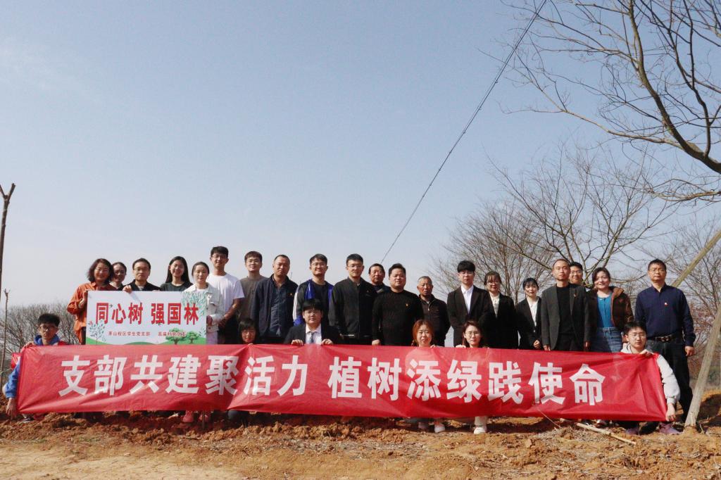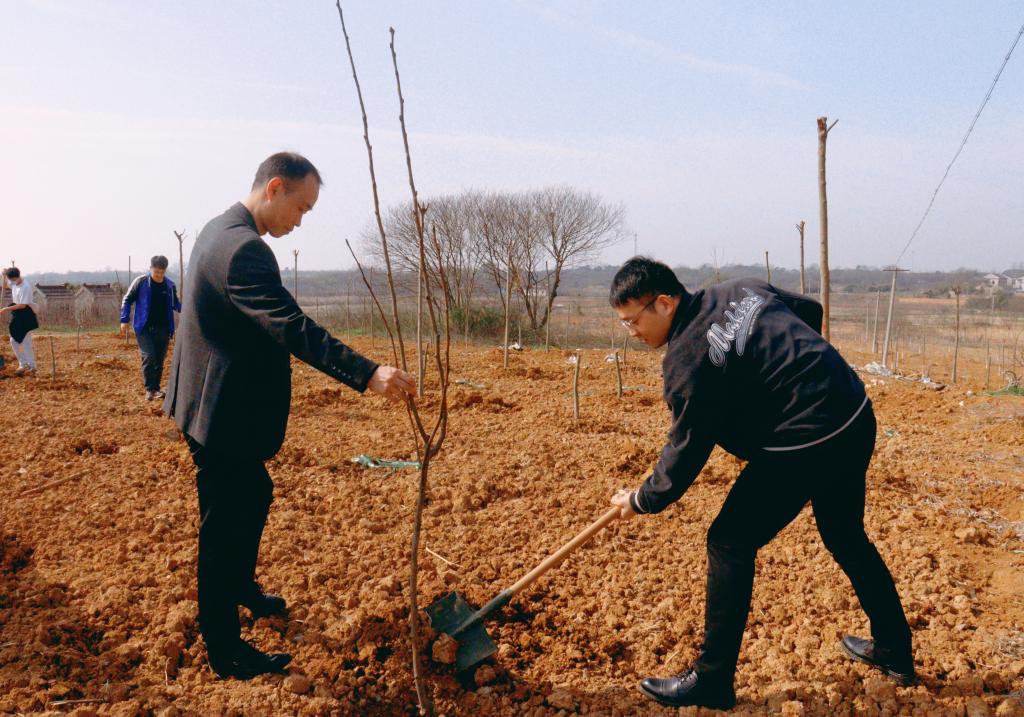 仪式结束后,两个支部联合开展了 “共栽同心树、共植强国林”主题植树活动,植树现场党员们分工明确,配合默契,有的挥锹挖坑,有的栽树培土,有的提水浇灌,一道道工序细致认真、有条不紊。经过半个多小时的劳作,所有的树苗终于都已“安家落户”,30余株新栽的梨树迎风挺立,成为高庙村头一道亮丽的风景线。