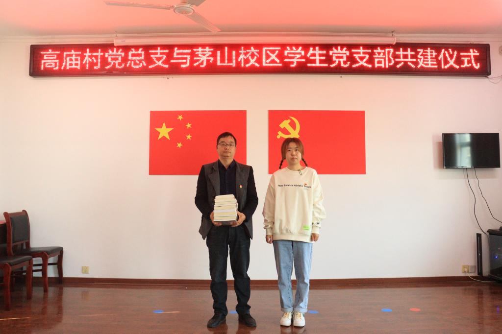 在党建活动室里,高庙村党总支书记高海军对校区学生党支部到来表示热烈的欢迎,向茅山校区的支持表示衷心感谢,并详细介绍了高庙村的基本情况和党建工作品牌。随后,两个支部按照“以共建促党建、以共建促了解、以共建促合作、以共建促发展”的原则,签订了共建协议、举行了书籍捐赠仪式。校区学生代表还带来了小合唱《不忘初心》,展现了新时代青年学生听党话、跟党走,奋发进取、斗志昂扬的精神风貌。