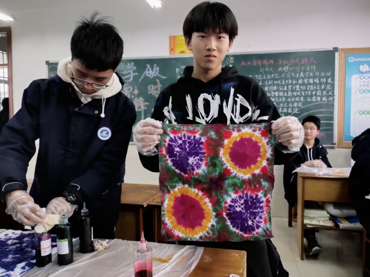 课程以非遗文化中的扎染技艺为基点,由“植物染”引入。段老师详细为大家讲解了扎染的制作原理和操作方法之后,带领同学们一起动手体验,并鼓励学生大胆尝试,充分发挥想像力和创新力,釆用多种方法进行扎染。一块块棉布在同学们手中呈现出丰富的色晕,深浅不一的色彩在棉布上呈现出独特的花纹,每一块布艺扎染都是同学们精心设计的作品,也是非遗文化在省句中的延续。