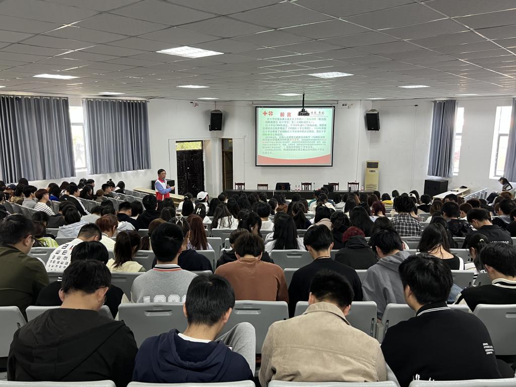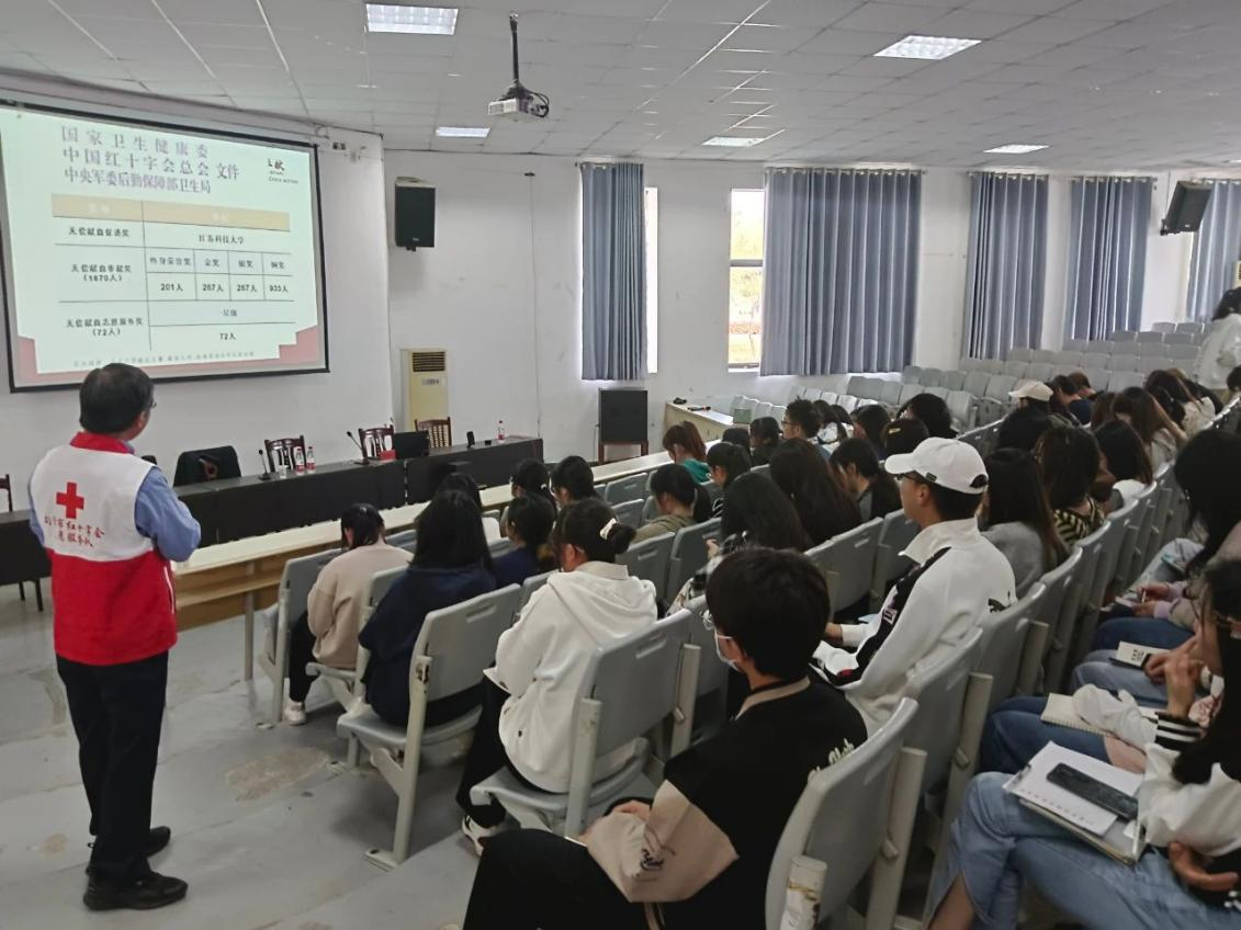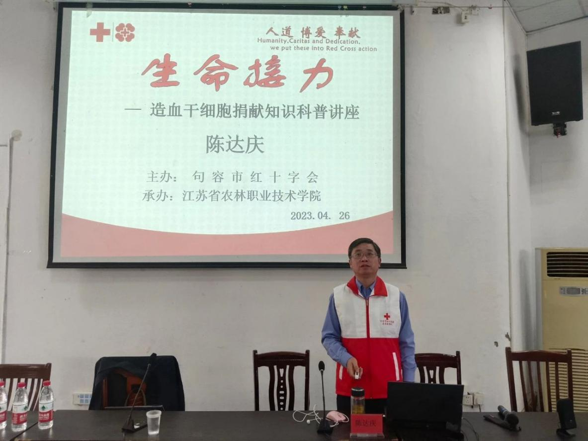 为弘扬“人道、博爱、奉献”的红十字会精神,科普造血干细胞捐献知识,4月26日下午,茅山校区在报告厅举行“生命接力—造血干细胞捐献知识”公益讲座。讲座由原句容急救站主任、党支部书记、卫生管理研究员陈达庆主讲。