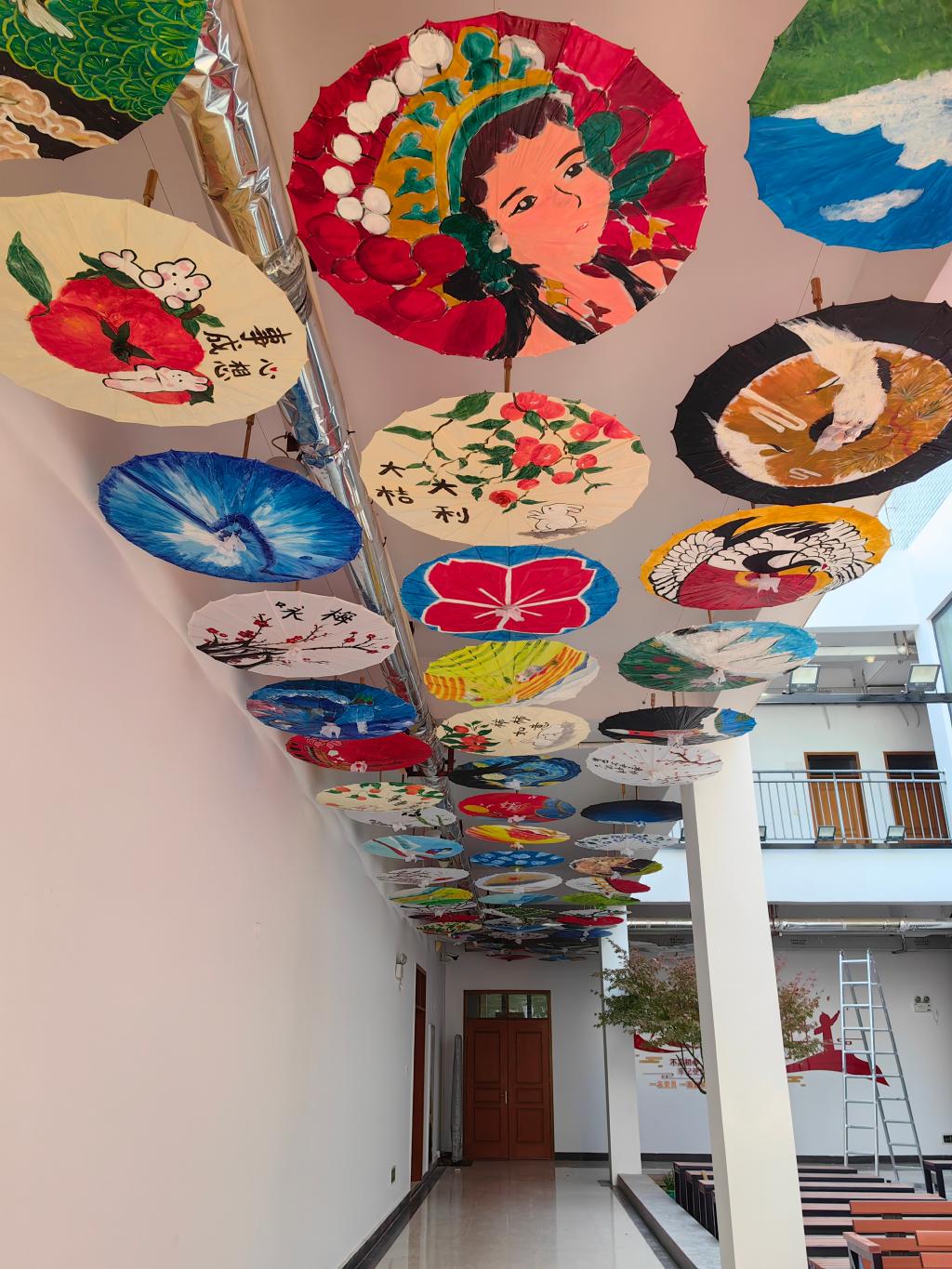 手绘油纸伞活动得到了茅山校区广大师生的积极响应,共收集来自师生的作品150多幅。绘制好的油纸伞展开悬挂在茅山校区党建文化长廊顶端,起到了很好的装饰效果,让整个长廊充满了浓厚的艺术气息,格调高雅。伞骨为竹,竹报平安,寓意节节高升。伞形为圆,寓意美满、团圆、平安。一把把油纸伞汇聚了同学的辛勤汗水和创意构思,一笔一画寄托着同学们对祖国的美好祝福。