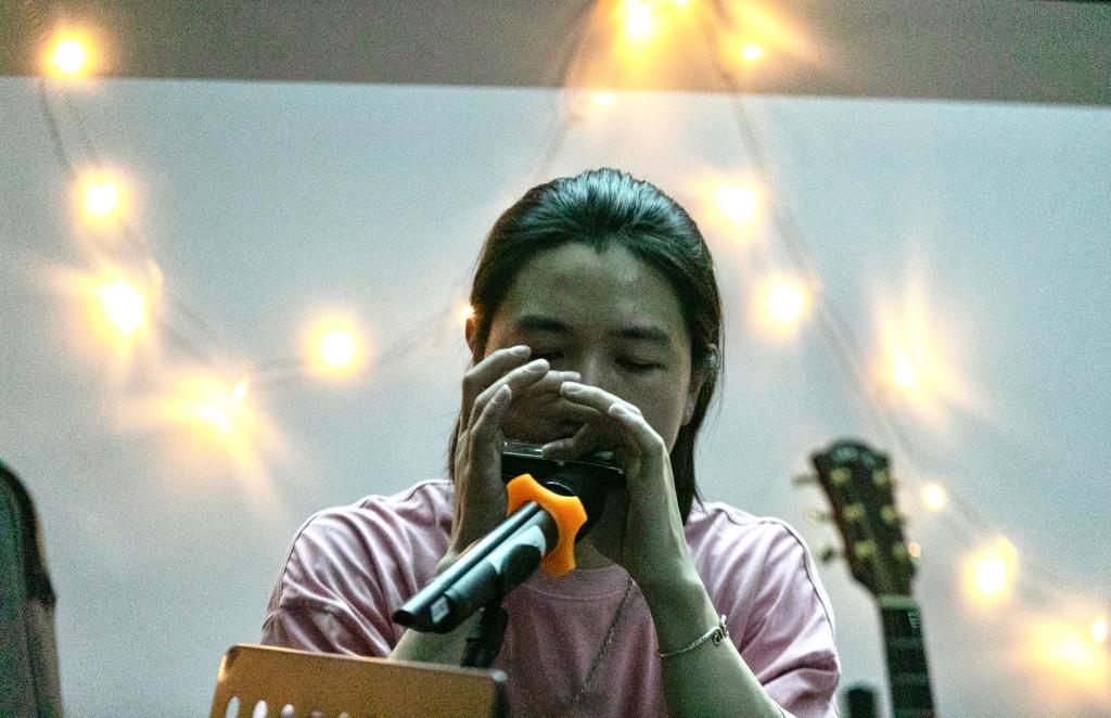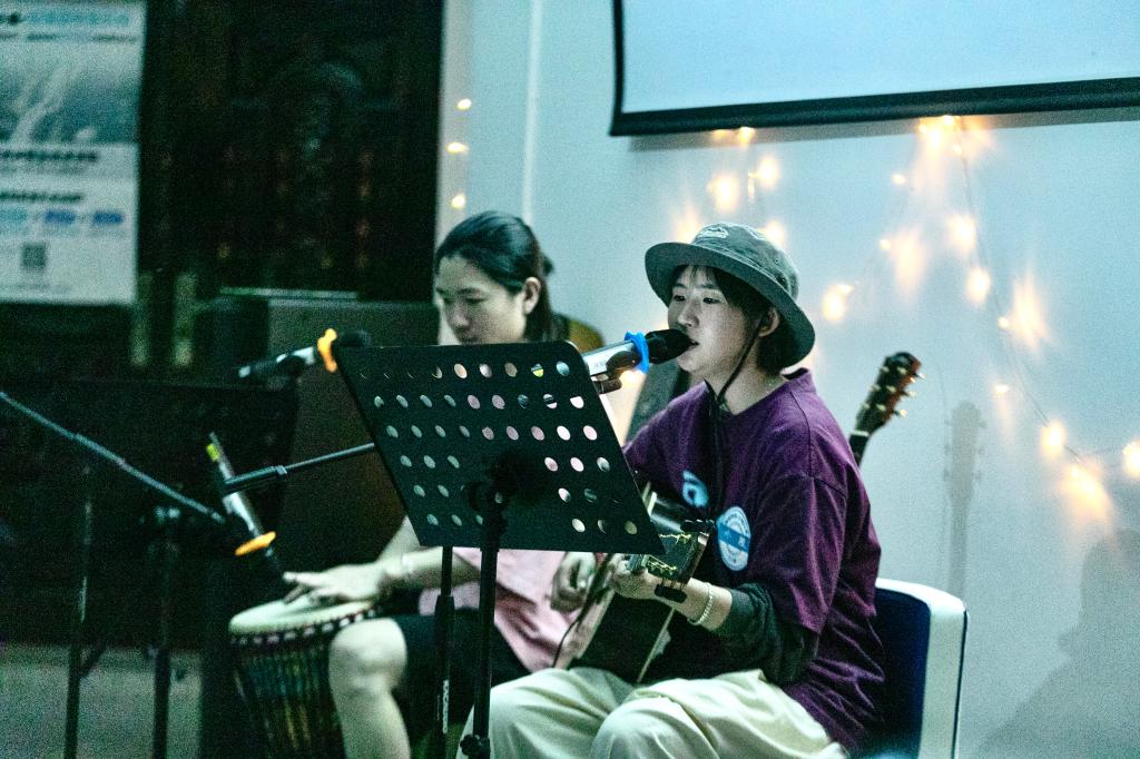 来自小屋的歌手钟不悔和可可,背着吉他带着鼓,将他们独特的经历融入歌声,温暖着在场的农林师生。他们不仅为农林的同学们演唱了动听的民谣,并和大家分享他们的故事、歌曲里的故事,使听众们沉醉于歌声与故事中。