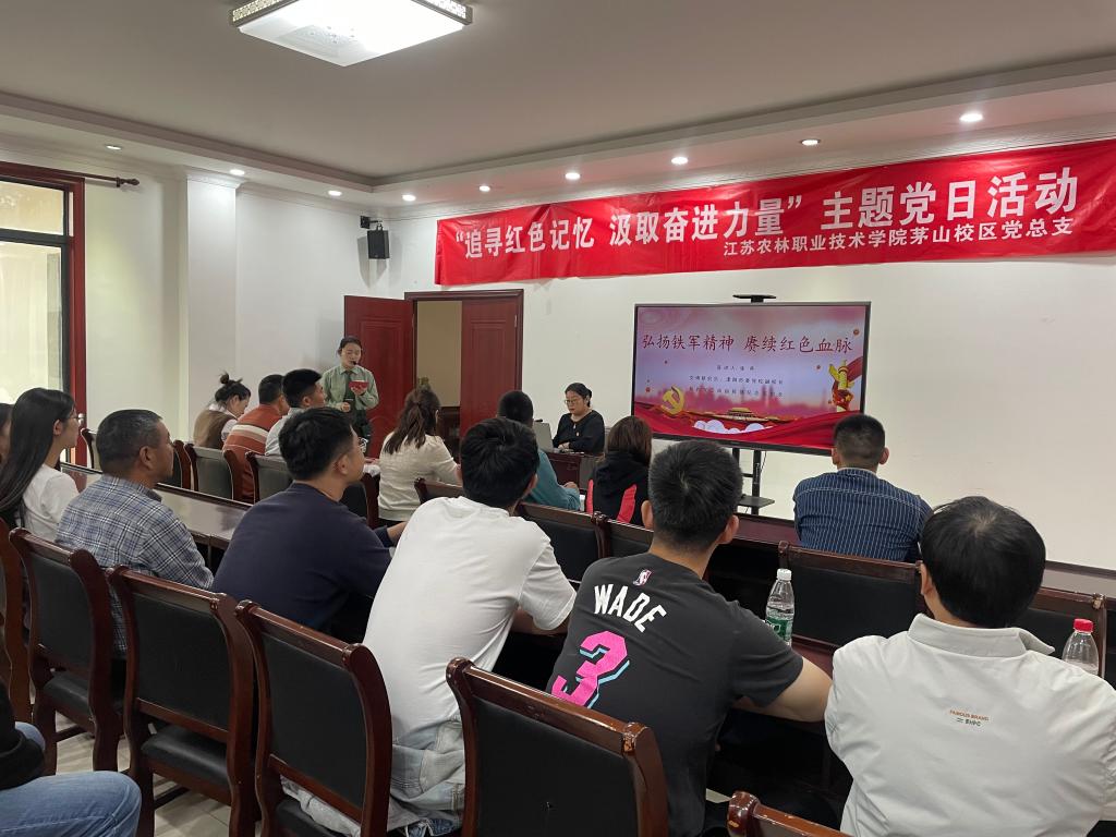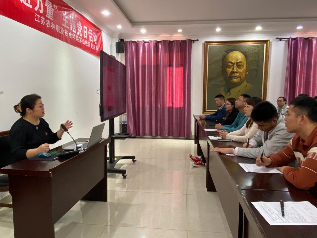 主题党日活动现场,茅山校区党总支邀请了新四军江南指挥部纪念馆馆长张燕为党员们带来一堂生动的党课。她介绍了新四军江南指挥部在水西村建立,带领党员重温了陈毅、粟裕在此战斗生活的峥嵘岁月。她从皖南事变中新四军司令员成功突围的历史故事讲到国家“一带一路”倡议,深刻阐述了中国共产党人的崇高追求和理想信念。