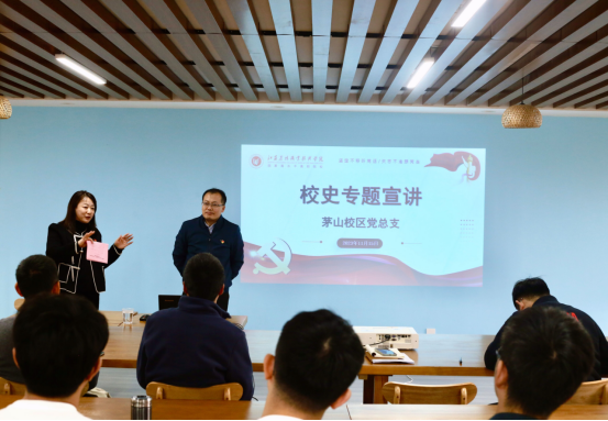 11月15日,茅山校区“回望百年征程 矢志立德树人”校史宣讲活动在新禾读书吧举行,马克思主义学院党总支副书记、副院长唐智老师担任主讲,茅山校区党总支负责人董慧同志主持,全体教职工和部分学生干部参加了活动。