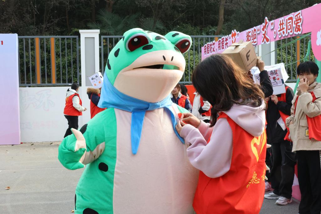 活动现场,防艾氛围浓厚。设有佩戴红丝带、知识讲解、有奖竞答、爱的抱抱等环节。志愿者们戴上头套、系上红丝带,化身“防艾宣传员”以多样的形式向同学们宣传讲解艾滋病的基本知识、主要传播途径和预防措施等知识。最后,师生纷纷在印有“凝聚社会力量,合力共抗艾滋”的横幅上签字明誓。