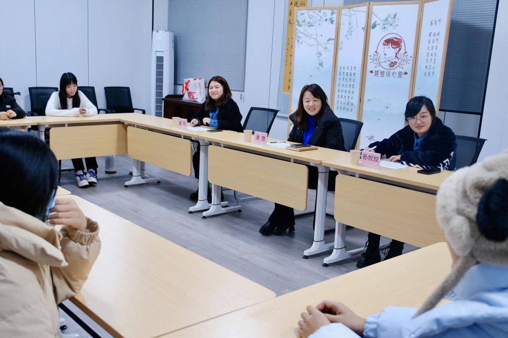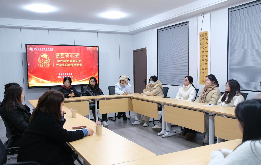 为引导大学生树立正确的恋爱观,营造积极向上、健康和谐的校园环境,12月15日,慧姐谈心屋举行了“理性恋爱,青春无憾”——大学生恋爱观交流会,茅山校区党总支负责人董慧,慧姐谈心屋相关成员以及13名来自各专业的女学生代表参加了此次活动。