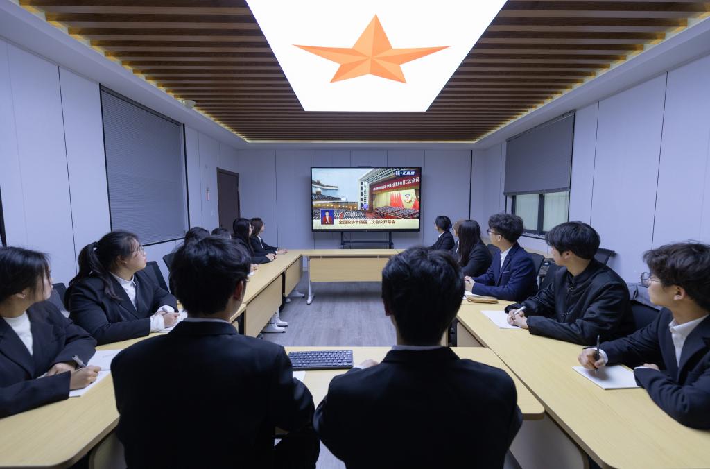 与时俱进同步学。茅山校区团委第一时间组织校区73个团支部收看全国两会开幕式直播,持续关注全国两会的进程,使大家了解两会动态,掌握两会内容,营造了浓厚的学习氛围。