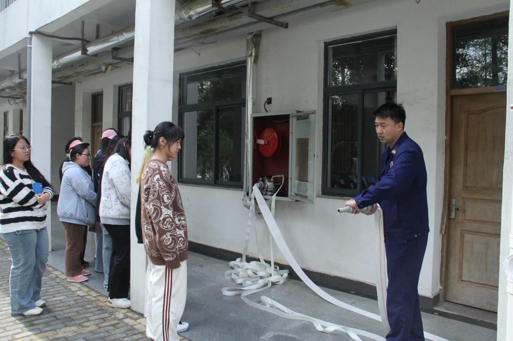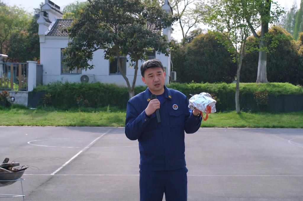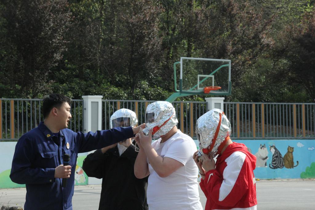 活动分为消防疏散练、消防技能培训实践等环节。浓烟起,警报响。同学们在保安和驻楼老师的组织引导下,湿巾捂鼻,低姿匍匐,以最快的速度安全有序撤离到室外指定区域。吴鹏就校园火灾的常见类型、产生原因、灭火方法进行了讲解与分析,演示了灭火器、消火栓和防烟面具的使用,并指导同学们进行了现场操作。
