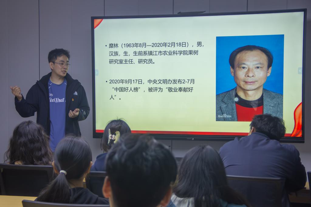 戴老师首先介绍了我们学院杰出校友糜林同志的生平经历,糜林同志一生致力于科技富农、脱贫攻坚,扎根“三农”一线33年,帮助农民掌握先进栽培技术,实现脱贫致富;然后通过讲述糜林同志在农业科学研究和技术推广、汶川地震援助、贫困地区援助等主要事迹,展现了糜林同志对农业科技工作的敬业奉献精神,以及对脱贫攻坚事业的巨大贡献。同学们听后纷纷表示要向糜林同志学习,学习他扎根土地、一生为民的情怀;学习他刻苦钻研、精益求精的品质;学习他淡泊名利、不计得失的奉献精神。