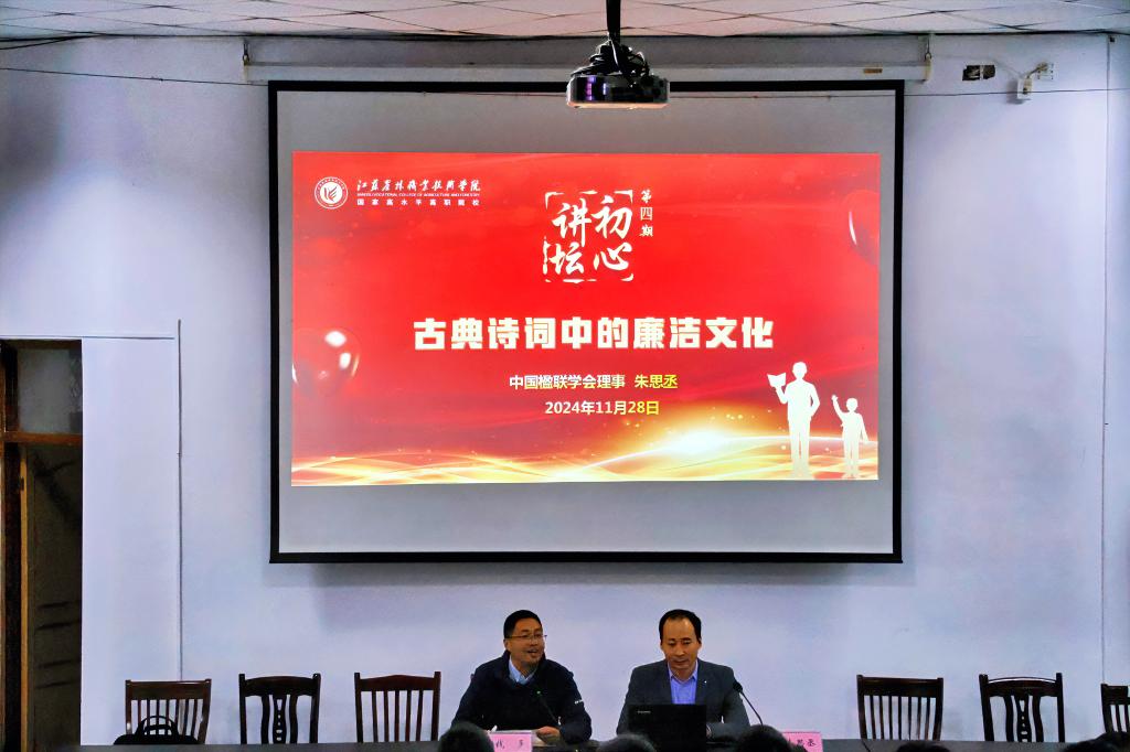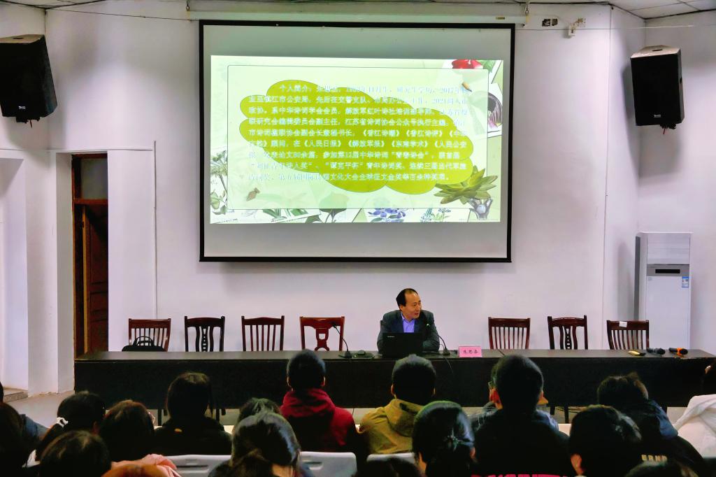 11月28日下午,由茅山校区党总支主办,三育文苑学生社区、翰墨农林书画社承办的第四期初心讲坛“古典诗词中的廉洁文化”主题讲座在报告厅举办。讲座由中国楹联学会理事,中华诗词学会会员、镇江诗词楹联协会副会长兼秘书长朱思丞主讲,200余名师生现场聆听学习。
