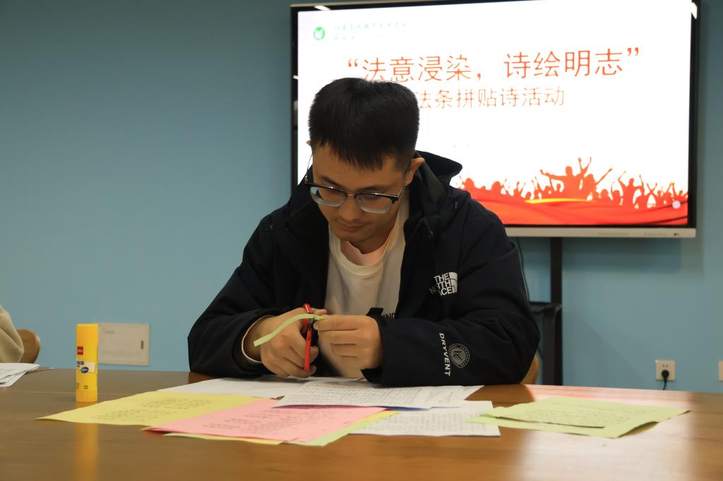 “守法治之约,站成永恒。明法治精义,守望孤独”12月3日下午,茅山校区学生党支部举行“法意浸染,诗绘明志”法条拼贴诗活动。活动现场,党员老师们发挥奇思妙想将法条与诗情融合,以"法"为载体,以"字"传情,以"宪法"为基础,以"拼贴"为方式,自由重组语句顺序,体会灵感的瞬间迸发,创作出属于自己的法律拼贴诗,将法治理念生动描绘出来,在感受诗歌之美的同时领悟法律的庄严魅力。