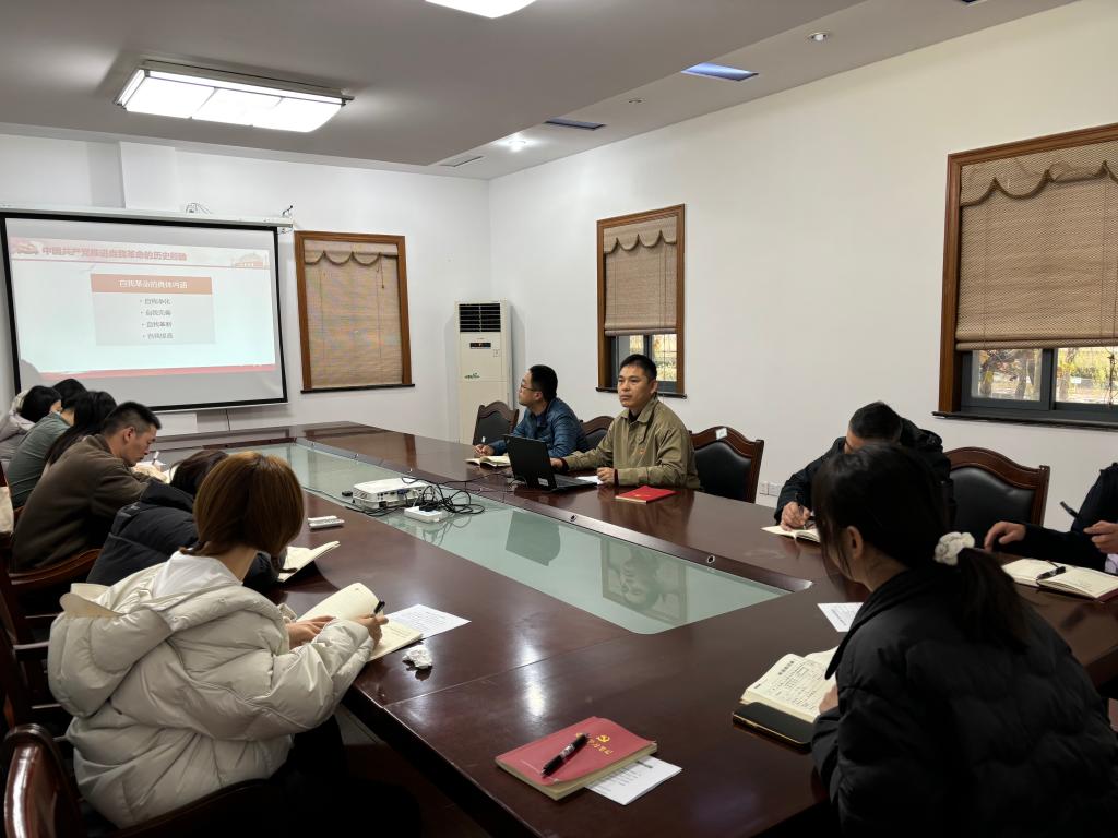 12月4日下午,茅山校区教工党支部书记孙洪亮同志在行政楼二楼会议室讲授了《中国共产党推进自我革命的历史经验》为题的专题党课,支部全体党员参加。