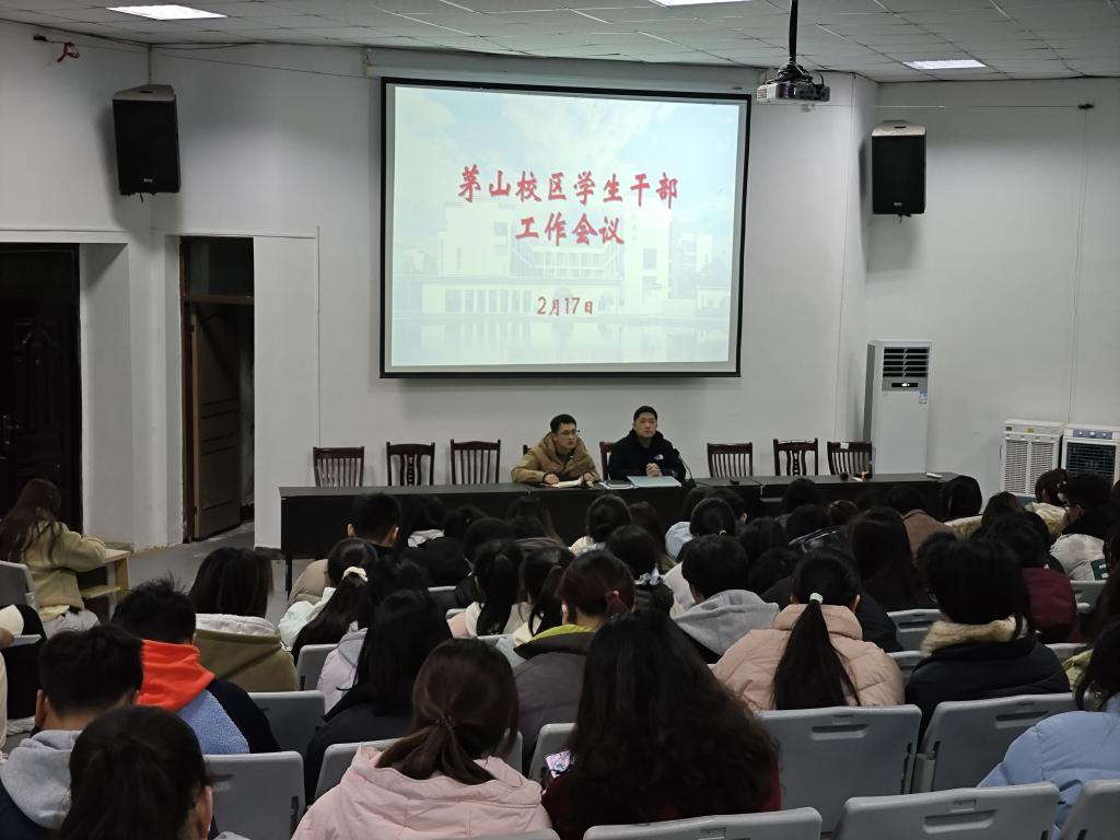 2月17日晚,茅山校区在学术报告厅召开了新学期学生干部工作会议,校区党总支副书记孙鑫出席会议,校区学生会、团委学生干部,各班级主要学生干部参加了会议。会议由辅导员胡国栋主持。