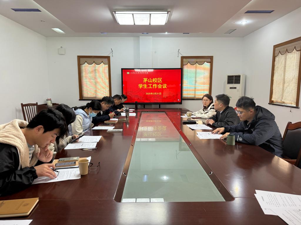 3月31日上午,茅山校区在行政楼会议室召开春季学期第四次学生工作例会。校区党总支副书记孙鑫主持会议,全体辅导员、班主任参会。会议以“守牢学生安全底线,稳步推进各项工作”为主题,通报第五周、第六周常规工作情况,并对下一阶段重点工作进行部署。