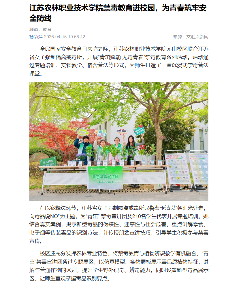 【交汇点】报道江苏农林职业技术学院茅山校区禁毒教育进校园,为青春筑牢安全防线
